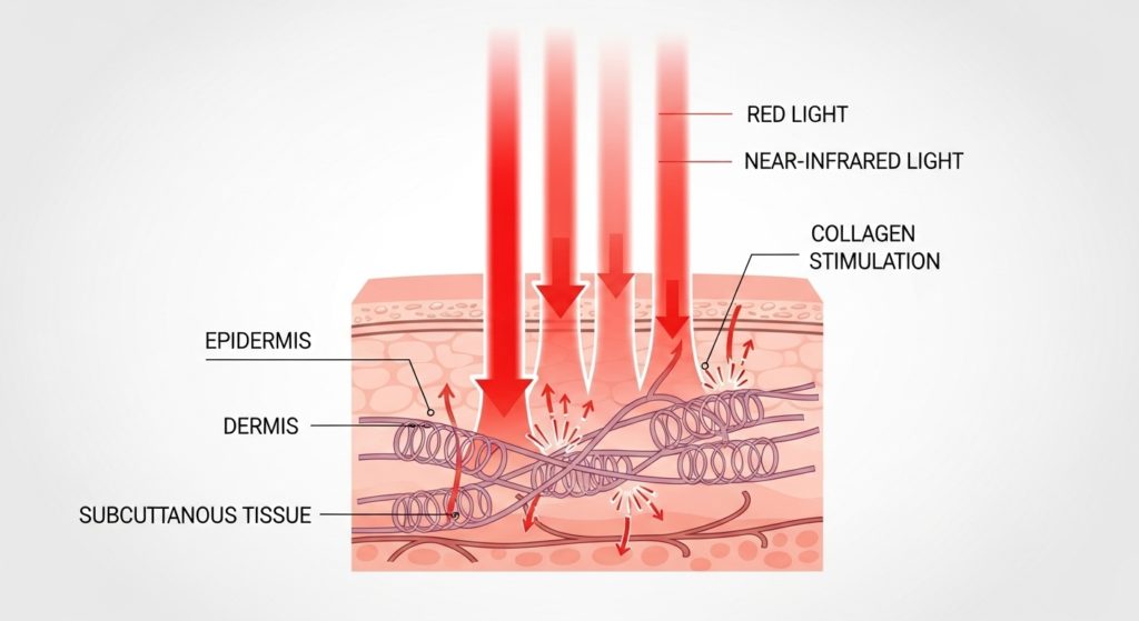 - 近赤外線LED(波長850nm前後):深層真皮〜皮下層に届き、コラーゲン・エラスチンの生成を促進。